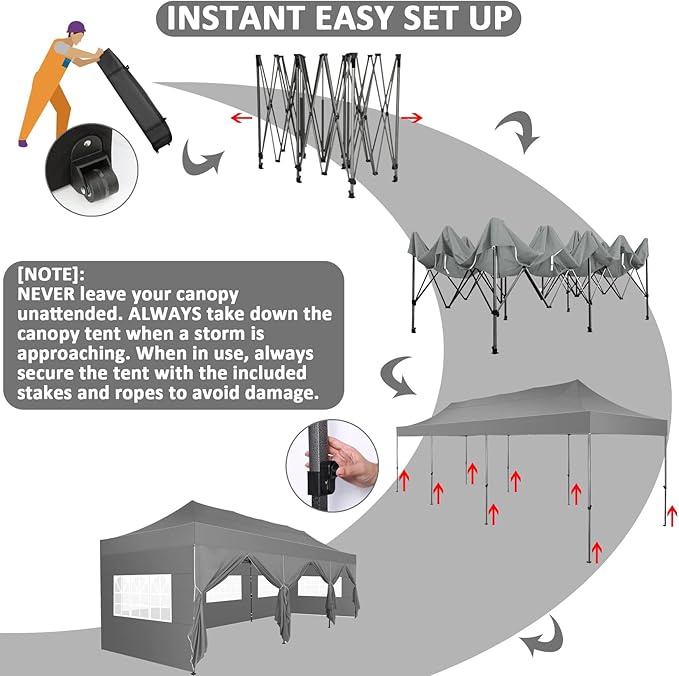 • 【3 Height Settings】10x30 pop up party tent straight leg has 3 height settings. Thumb latch lock system easy to lock and release, raise the pop up tent to a desired height. Canopy tent 10x30 straight leg height options: 220cm/86.6inch, 230cm/90.6inch, 240cm/94.5inch. Corresponding party tent center height options: 305cm/121.1inch, 315cm/124.0inch, 325cm/128.0inch. 10x30 canopy with sidewalls perfect for commercial activities, camping, festivals, tailgating, backyard events and etc..