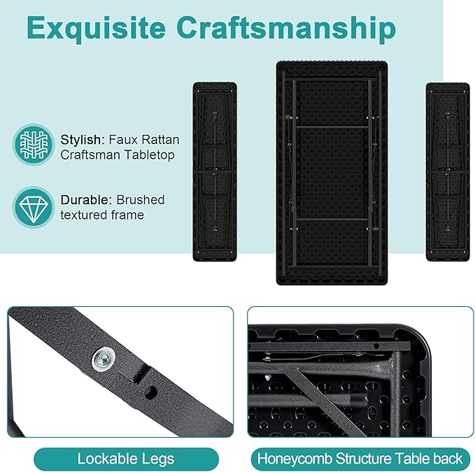 • Faux Rattan Design - This folding table and chairs are crafted from faux woven rattan, featuring modern and stylish style. Perfect for decorating your patio, poolside, balcony, garden and porch. Ideal for both indoor and outdoor use, providing a place for you and your friends to enjoy and relax.