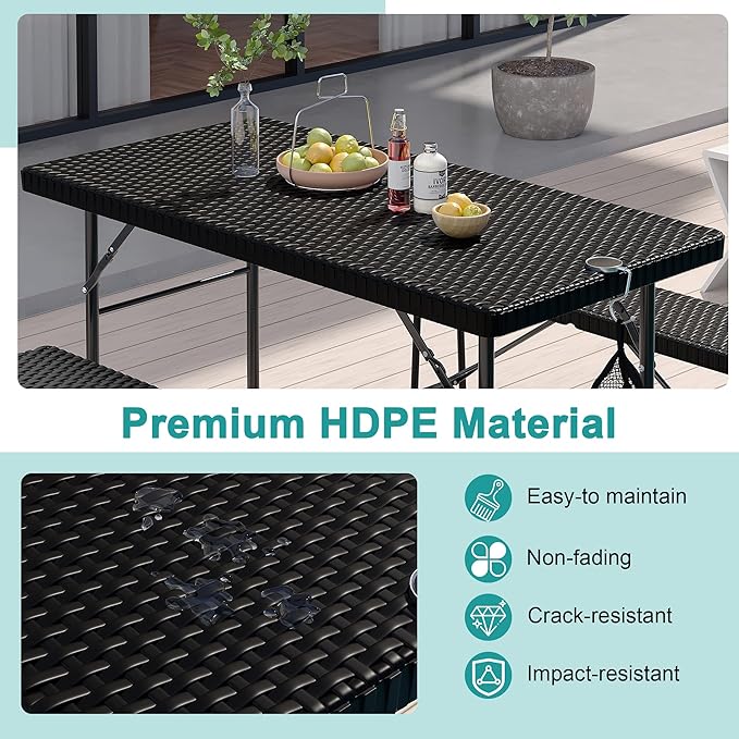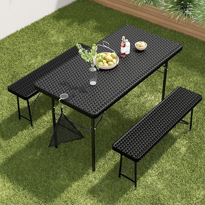 VECELO 3 Piece Folding Picnic Table with 2 Benches, 47.2" Faux Rattan Patio Set with Mesh Bag, Heat-Resistant & Waterproof, for Indoor Outdoor Use, Matte Black