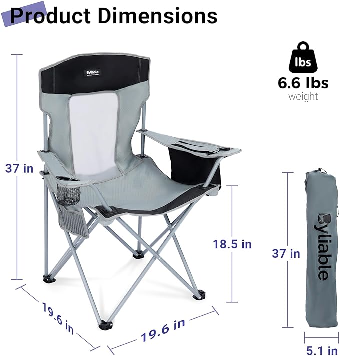 • Comfortable And Sturdy: This camping chair for adults features an ergonomic high-back design for comfort, even for extended periods of sitting. Its unfolded size is: 37" L x 19.6" W x18.5''H, with comfy size design, it is a great choice for camping