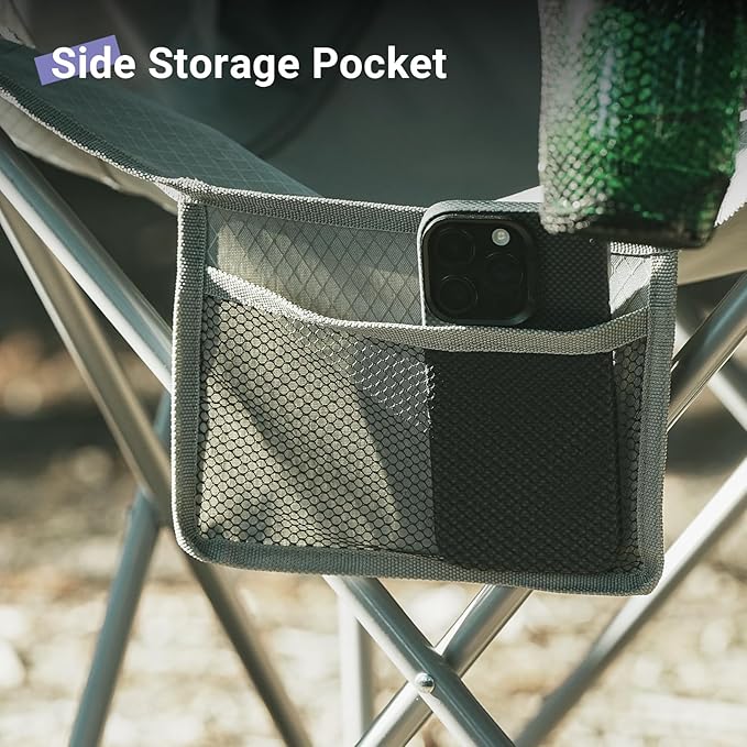 • Convenient Storage: The right armrest of this foldable camping chair is equipped with a mesh cup holder for easy access to water cups or drinks. The side pocket can be used to store small items for camping and soccer, which is very convenient to use