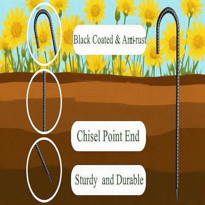 • 【Sharp Tips】The j hook stakes have a chiseled end to facilitate ground penetration, the metal steel is sturdy and does not deform when hammered into tough ground. These ground stakes are thick and heavy duty and they will not budge in a strong wind.