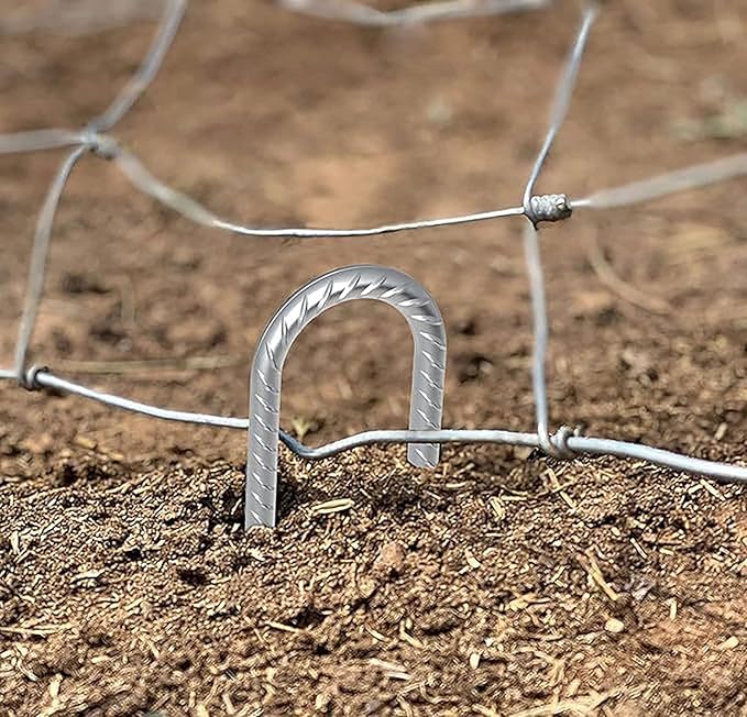• 【Fence Stakes 16 inches】Sold in bundles of 10 pieces. 16 inches length from tip to hook, 5/16 inch (8mm) diameter j stakes. The hook is 3" and spacing is 1.6", pefect for chain link fence, holding outdoor decorations, greenhouse, canopies, gazebos and giant inflatables etc.