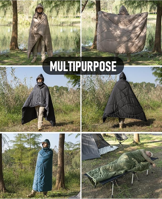 • MULTIFUNCTIONAL. With the buttons, this blanket can be used as quilt, poncho and shawl, and it won’t slip off your shoulders. Enjoy warmth and comfort in the car, office, outdoors, or at home, letting warmth accompany you anytime. Great for camping, backpacking, hiking, trekking, tailgating, hunting, fishing, mountaineering, motorcycling, traveling, skiing, snowboarding, lounging, picnics, concerts, music festivals, beach trips, sporting events, airplane trips, and other outdoor activities.