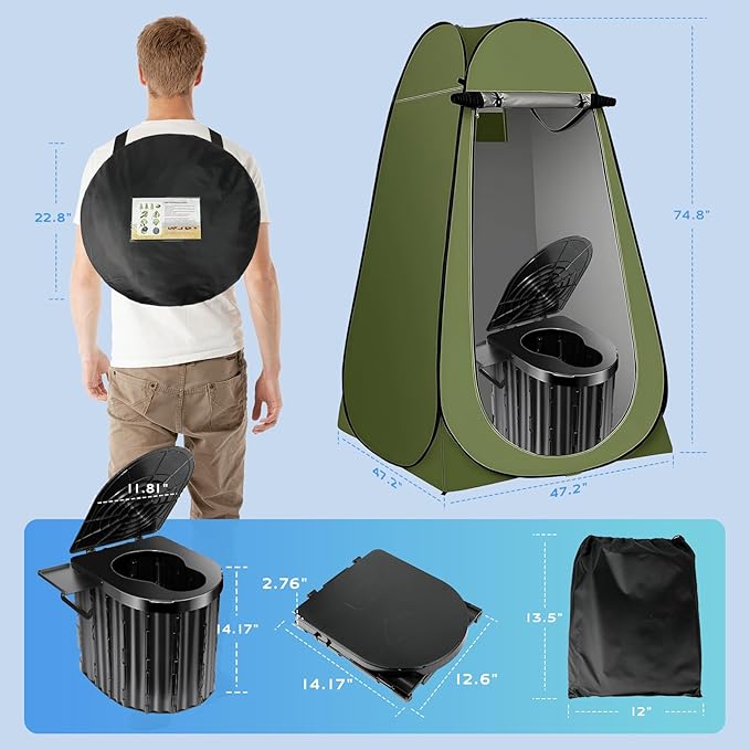• Compact and portable - Both privacy tent and portable toilet are feature foldable design for easy carry. The baño portatil camping folds down to a compact size of 2.7 x 15.2 x 12.4 inches. The outdoor toilet tent unfolds to a spacious space of 47.2" L x 47,2" W x 74.8" H and folds down to a compact 23 x 23 x 2 inches. The emergency toilet and tent combo fits into the included bag for easy storage and portability.