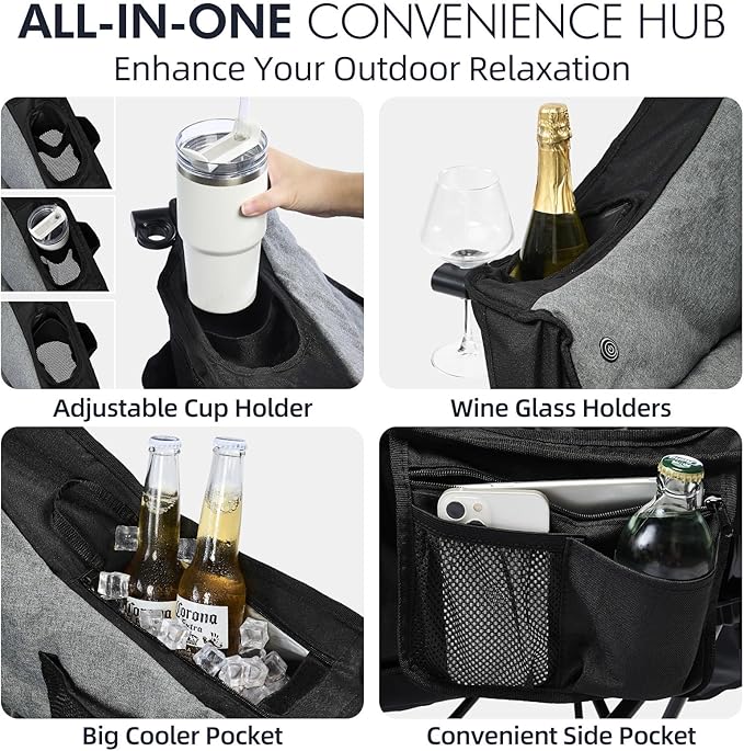 • Extra Storage Space - The camping chair provides wide cup holders and dedicated wine glass holders; side pockets store phones,or carry bag. Our heated lawn chair delivers organized storage for tailgating and hunting gear.