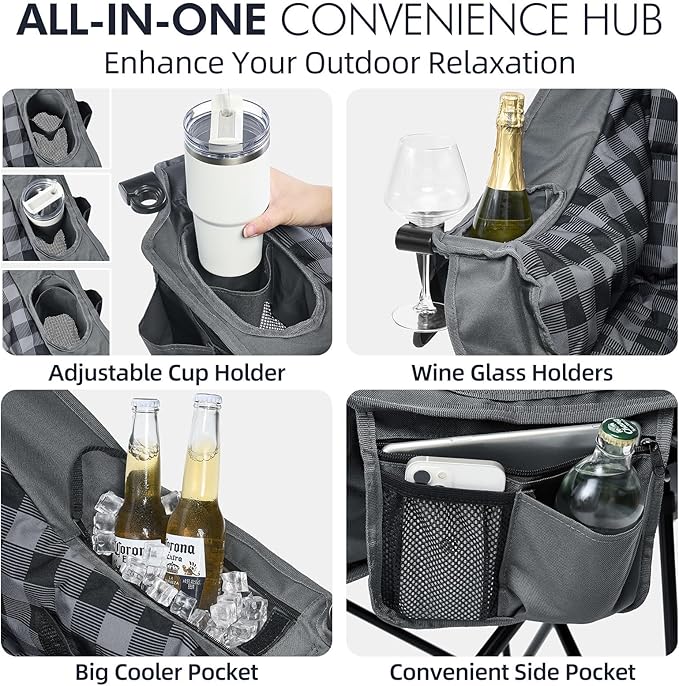 • Extra Storage Space - Our foldable chairs for outside features side/back mesh pockets, along with adjustable cup holder and large insulated cooler bag. Perfectly stores drinks, snacks, and phones within easy reach. It a versatile choice for comfortable padded camping chair for adults.