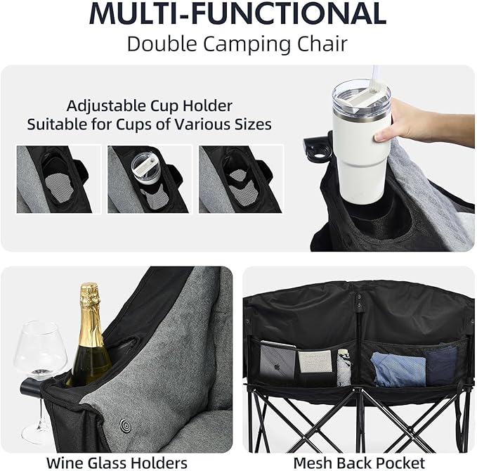 • Extra Storage Space - The two person camping chair provides wide cup holders and dedicated wine glass holders; Back storage pockets store phones, laptops, or compact blankets. Our heated lawn chair delivers organized storage for tailgating and hunting gear.