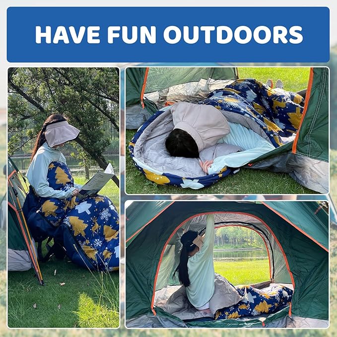 • Spacious & Comfortable: With dimensions of 33" x 87", this sleep bag comfortably fits a 6ft adult. The skin-friendly polyester fabric is soft, breathable, and designed for a comfortable night's sleep, whether you're indoors or enjoying the great outdoors, ideal for camping, hiking, and traveling. Fully open the warm sleeping bag and it transforms into a blanket or quilt, making it versatile for various camping needs, or as an emergency blanket for your vehicle