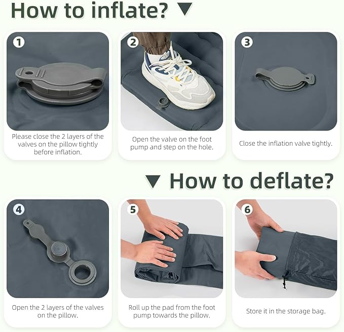 • 【Only 30s Step to Inflate & 1s Deflate】 Including an innovative built-in foot pump- Just pedal 30-60s to fully inflate the camping mat, which is convenient and easy, no longer need to inflate with your mouth, hands or carry a pump, and it only takes 1 second to quickly deflate. With the upgraded version of the air release valve with no leaking film, you shall never worry about air leaking!