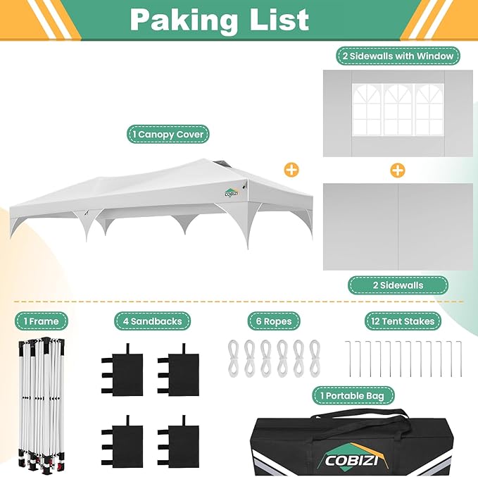• 【Packing List & Service】1 pop up tent frame, 1 canopy tent roof, 4 10x20 canopy sidewalls, 4 sandbags, 6 ropes, 12 tent stakes and a carry bag. Feel free to contact our customer service team. One-year after-sales protection for the canopy frame, fabrics, and accessories.