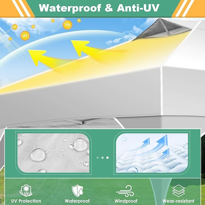 • 【Waterproof & UPF 50+ Protection】The 10x20 pop up canopy features commercial-grade 420D ripstop polyester that blocks 99% of harmful UV rays. This outdoor canopy tent provides reliable shade and waterproof protection with 2000mm water resistance. For longer lifespan, we recommend storing it when not in use.
