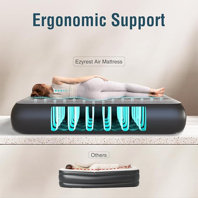 • Outstanding Safety and Comfort: Ezyrest single air mattress are made from an upgraded PVC material formula for better abrasion resistance and ductility. The unique Ring Inflatable Structure provides stability, reduces noise and prevents tipping or slipping. This supports our body and protects our spine when we lie down, and make sure for your ideal comfort