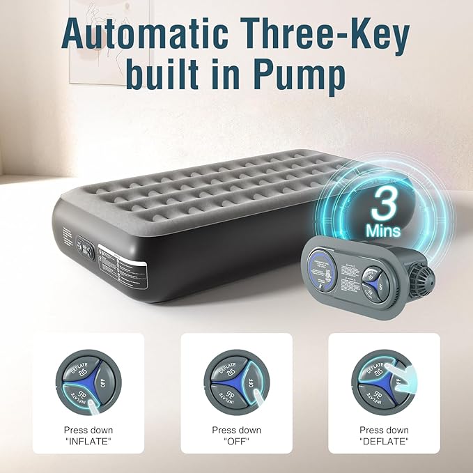 • Built In Pump: Three-Key built in pump allows you to operate with less effort when in- or deflating, and the full degree of inflation can be adjusted according to everyone's sleeping habits. The built-in 110V high power electric air pump has independent inflating, deflating and pause buttons, which can be quietly in- or deflated within 3 minutes with the press of buttom (Tips: This pump of twin air mattress doesn't support automatic stop of filling, you need to manually stop in- or deflation.)