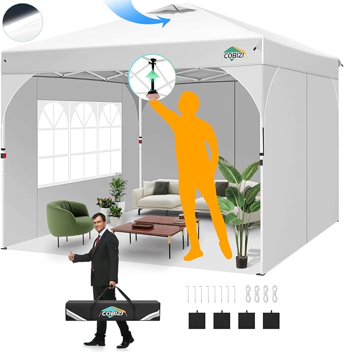 COBIZI 10x10 Pop up Canopy, Canopy Tent 10x10 with 3 Sidewalls, 1 Person Easy Set up, Tents for Parties, Outdoor Tent with Fluorescent Strip & 4 Sandbags, Waterproof, 3 Adjustable Height (White)