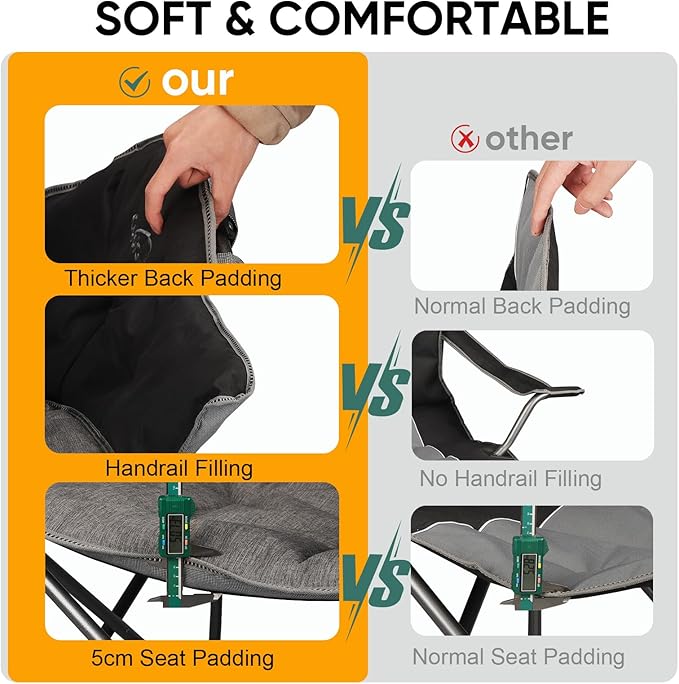 • Designed for your comfort: The backrest and seat of this camping chair are fully padded with 5cm thick cotton, which is soft and comfortable. The moon-shaped seat adopts ergonomic design, wrapping the curve to provide comfortable support for the back and thighs.