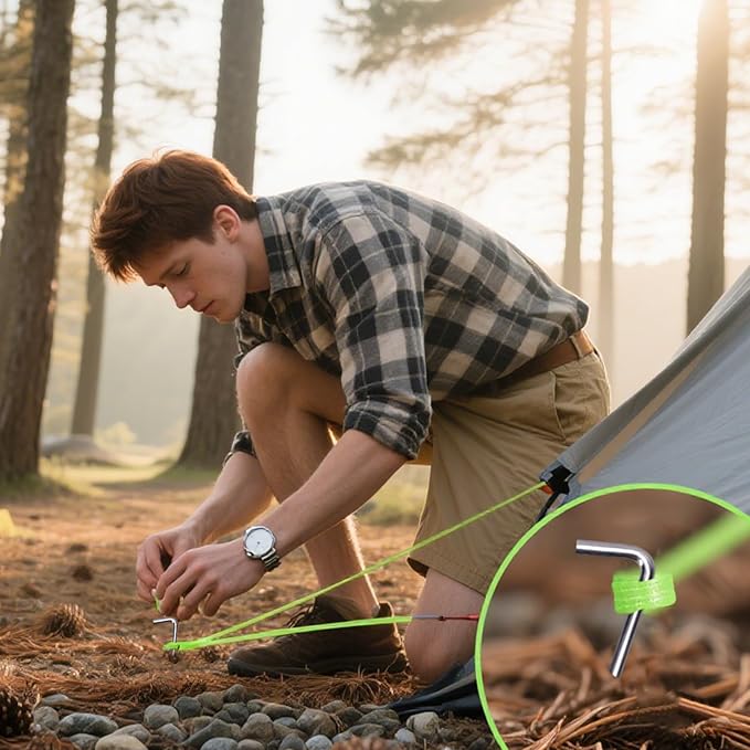 • Rugged 7-Shape Design: The tent pegs feature a 7-shape, maximizing ground contact area for grip. Insert the pointed end into soil or turf using your hand, foot, or a hammer, securing it firmly. This deep penetration ensures enhanced safety and stability