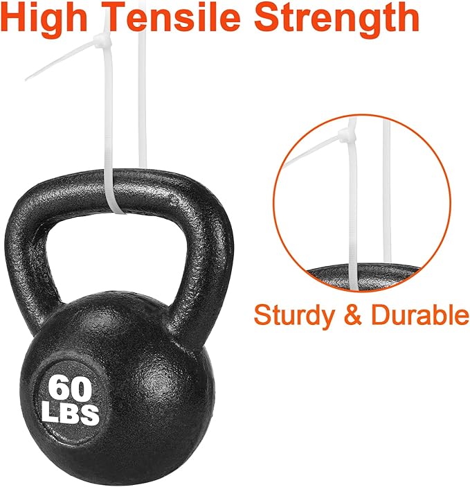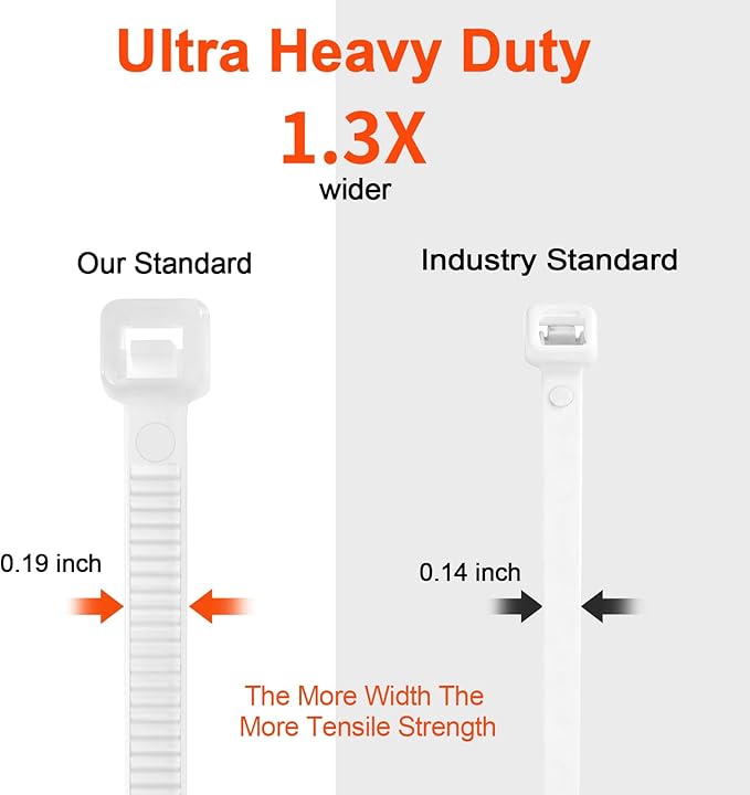 • 【60lb Tensile Strength】: The more width and Thickness, the more tensile strength. our zip ties 26 inch width is 0.19 inch(4.8mm), while industry standard is 0.14 inch(3.6mm), our zip ties 26 inch Thickness is 0.065" inch(1.65 mm), while industry standard is 0.05 inch(1.25mm),more tensile strength.