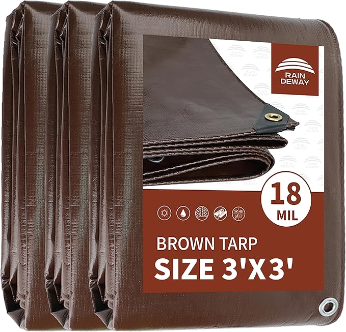 RAINDEWAY 3x3 Feet (3 Pack) Super Heavy Duty Tarp 18 Mil,Small Tarps UV Resistant, Weatherproof, Multipurpose Waterproof Poly Tarp Cover with Grommets and Reinforced Edges,Brown Tarps