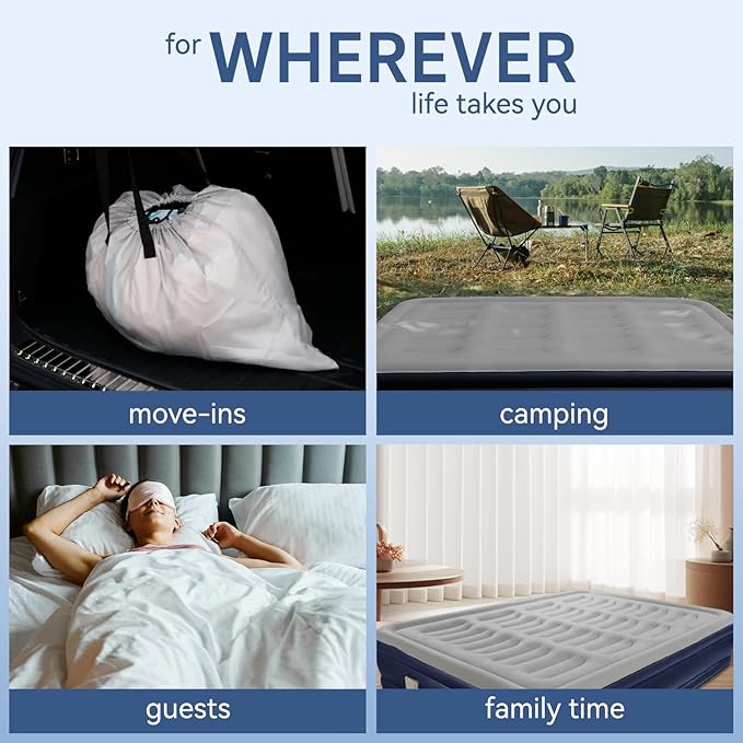 • 【Portable & Easy Storage】 Queen-sized air mattress inflates to 80” x 60” x 16” and deflates to fit in the free included storage bag.The included storage pouch makes the BEBAS air mattress easy to store and transport. Lightweight and compact, it fits neatly into your car or closet, ready for spontaneous trips or last-minute guests, ensuring quick and hassle-free setup.