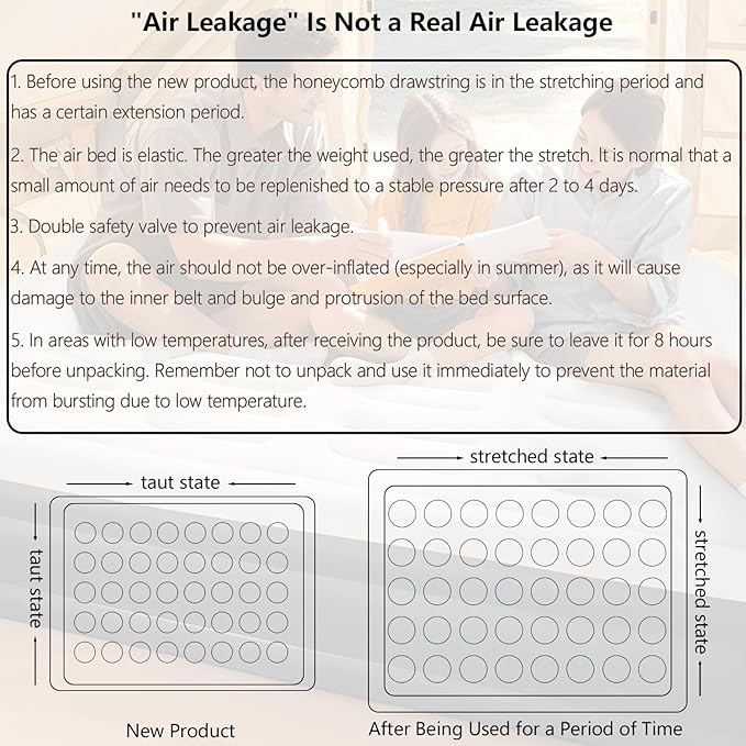 • 【Material Stretch】At first inflation the material will Stretch, which is sometimes misinterpreted as leaking; You will sense a loss of pressure, that's just the bed stretching, simply re-inflate the bed again; the bed will fully settle within 2-3 nights.