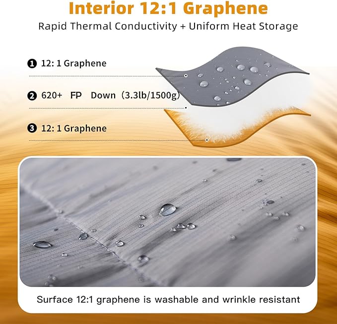 • 【Comfortable and Warmer】The sleeping bag measures 85.43"×32.28" and is filled with 3.3lb/1500g 620FP down. It is also made of graphene fabric for faster heating and more stable heat storage. Comfortable temperature up to 17.6°F, maximum insulation -11.2°F, fearless of harsh cold environments.