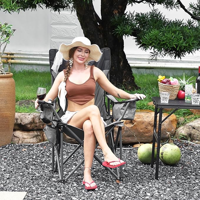 • 【Superior Comfort】This outdoor camp chair is ergonomically designed with a high back and headrest, along with full seat padding for maximum comfort. Ideal for long sitting sessions, it's the perfect choice for camping, beach outings, or relaxing in your backyard.