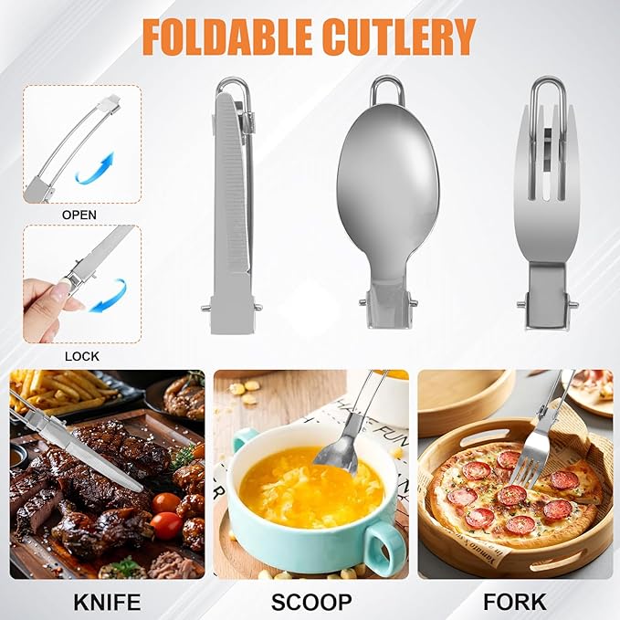 • Fast-Ignition Stove & Smart Design: Features a reliable mini stove noted for easy lighting. Foldable stainless steel utensils and collapsible stove maximize space efficiency. Heat-resistant handles stay cooler during cooking (use caution). Rust-resistant construction ensures dependable performance.