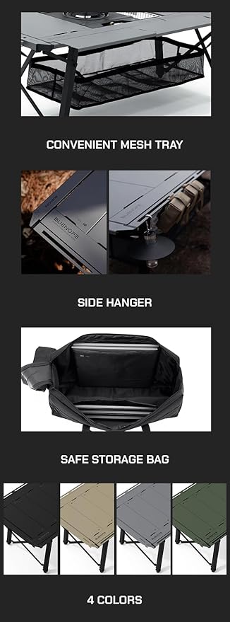 • Flexible Space Utilization: Features a three-stage adjustable leg height and supports the addition of side panels and drawer modules to adapt to various camping setups. (Height Adjustment Range: Level 1 – 16.14″ / Level 2 – 20.28″ / Level 3 – 24.41″)