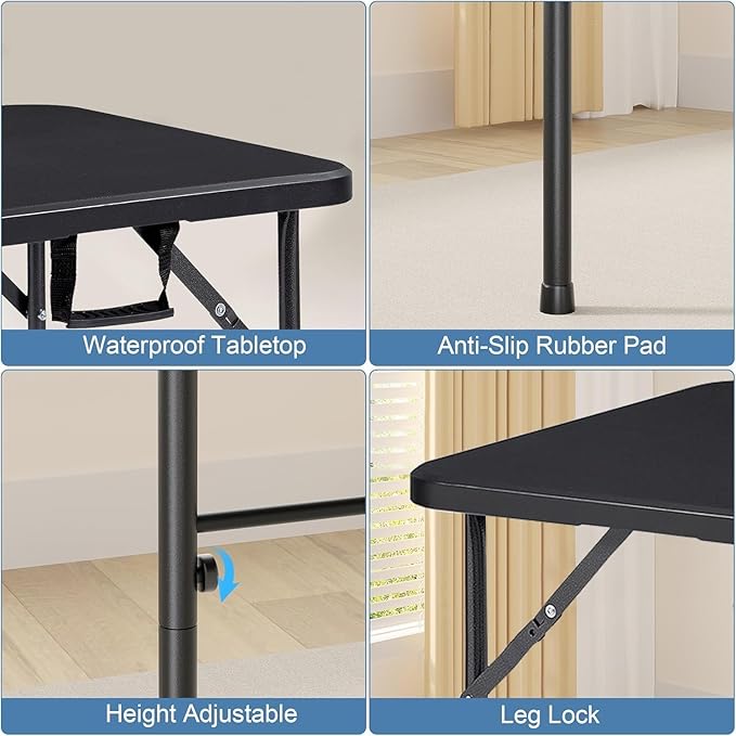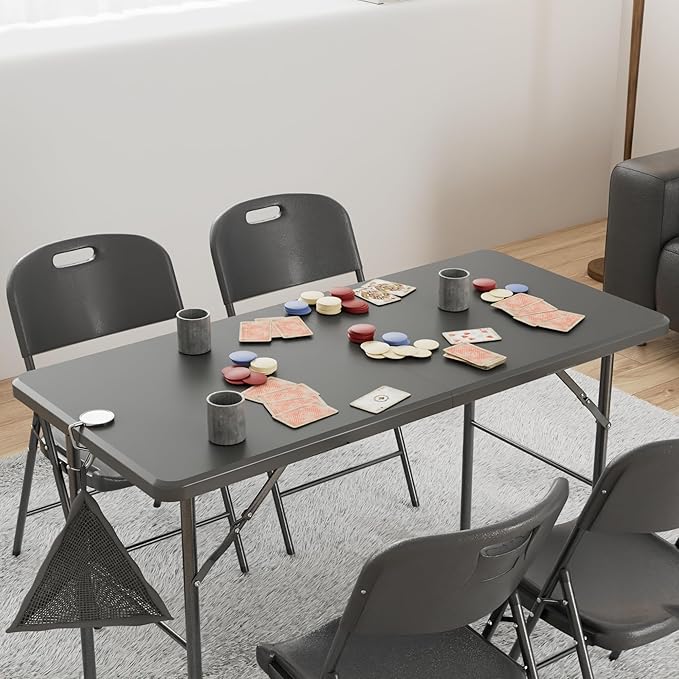 VECELO Folding Table 4 Foot with Mesh Bag, Indoor Outdoor Heavy-Duty Portable w/Handle,Fold-in-Half for Picnic, Party, Camping, Matte Black