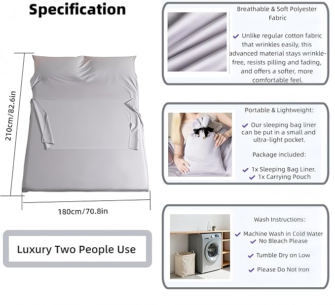 • LIGHTWEIGHT & PACKABLE: This travel sleep sheet line's large size is (70.9" x 82.7") (180 x 210cm) makes it a great double sleeping bag liner for two or a spacious single travel sheet.. Designed for travel, this liner weighs only 35.27oz(1000g) and packs down compactly into an included 11.6”x10.2” pocket, easy to carry for travel use and saving crucial space in your backpack or luggage.