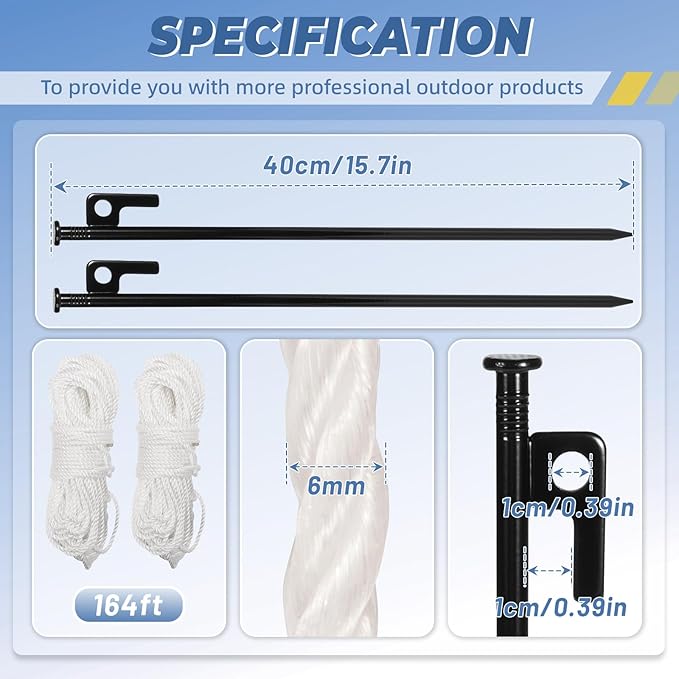 • 【Specification】①Braided PE Twine: 0.2in by 164ft, 150 kilograms of load-bearing capacity each; ②Metal Ground Stakes: 0.4in by 16in, 0.4-inch aperture.