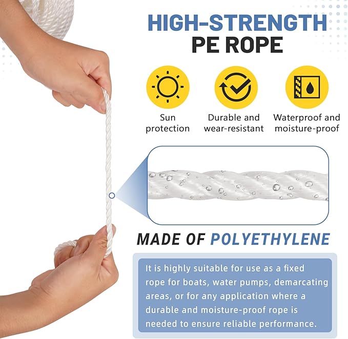 • 【Floating Rope for Water Use】This specialized floating rope is made of durable UV-resistant polyethylene (PE) material. This 164FT rope is highly suitable for use as a means of securing boats, water pumps, delineating areas, or any application that requires a durable and moisture-resistant rope to provide reliable performance.