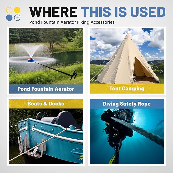 Pond Fountain Aerator Fixing Anchor Accessories, Includes 2×0.2in by 164ft Twisted Polyethylene (PE) Rope with 2×Metal Ground Stakes - Perfect for Outdoor, Camping, Landscaping, and Shipping