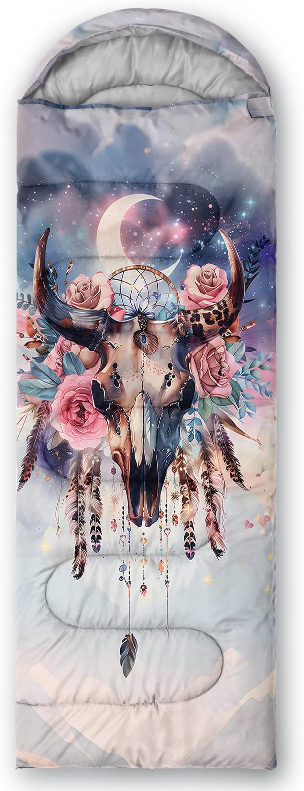 • Unique Bull Skull Design:This Bull Skull pattern sleeping bag is made of 3D digital printing with vibrant colors and patterns,size: 31W x 90L inches,temperature range: 32℉-77℉ (0℃-25℃),it also also have a weather resistant waterproof design to keep you warm and prevent you from any dampness,can be used in 3 seasons