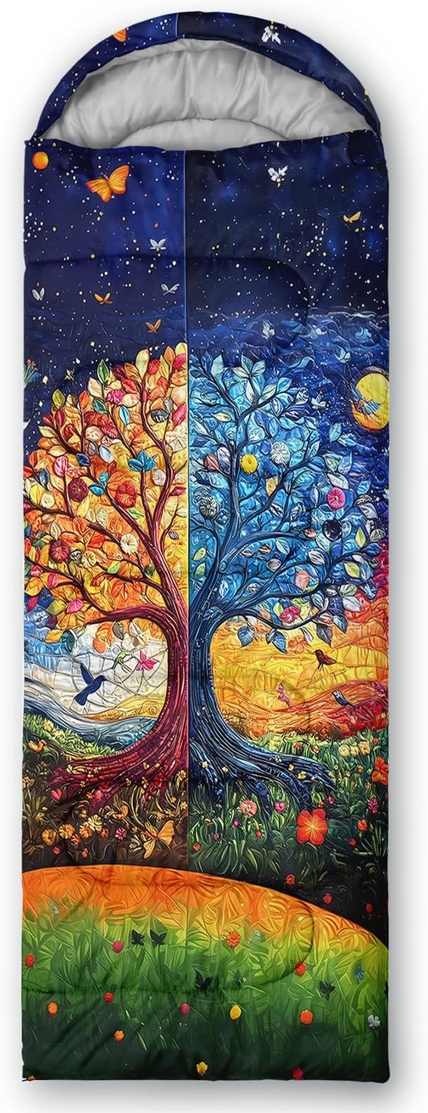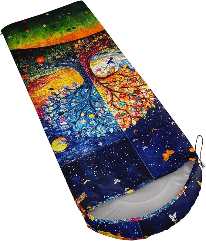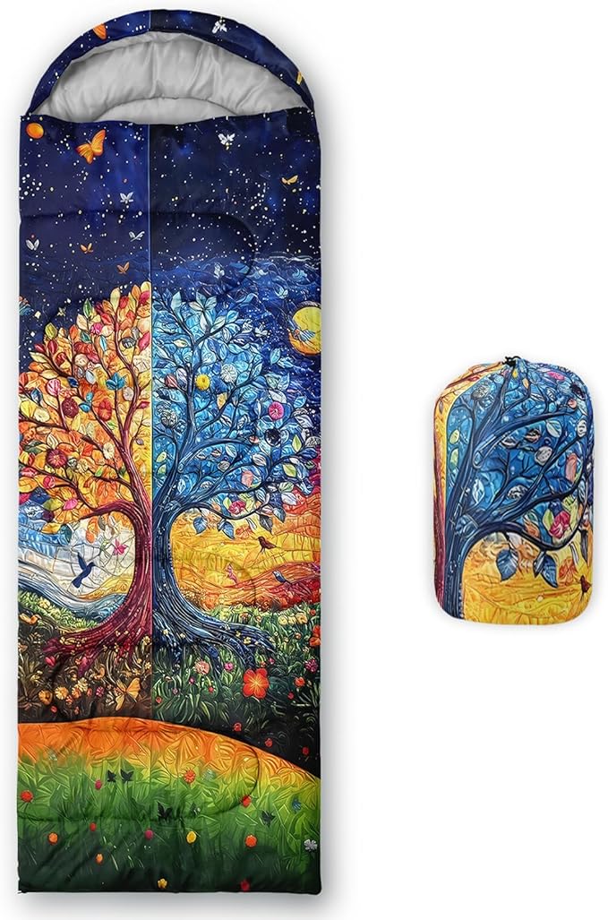 • Unique Tree of Life Design:This Tree of Life pattern sleeping bag is made of 3D digital printing with vibrant colors and patterns,size: 31W x 90L inches,temperature range: 32℉-77℉ (0℃-25℃),it also also have a weather resistant waterproof design to keep you warm and prevent you from any dampness,can be used in 3 seasons