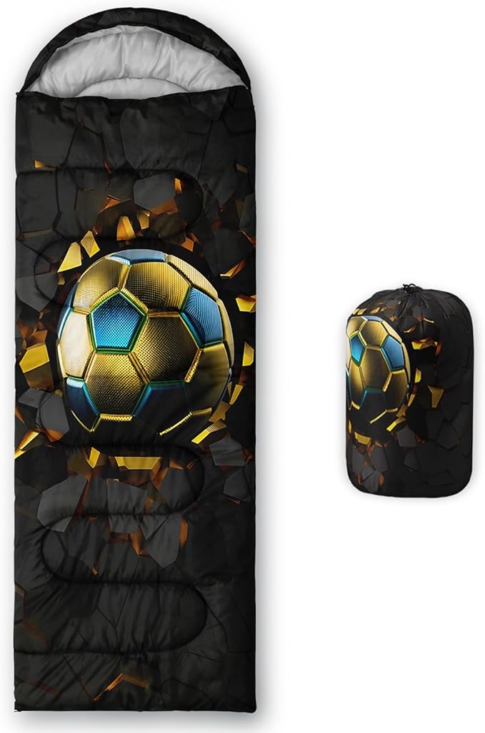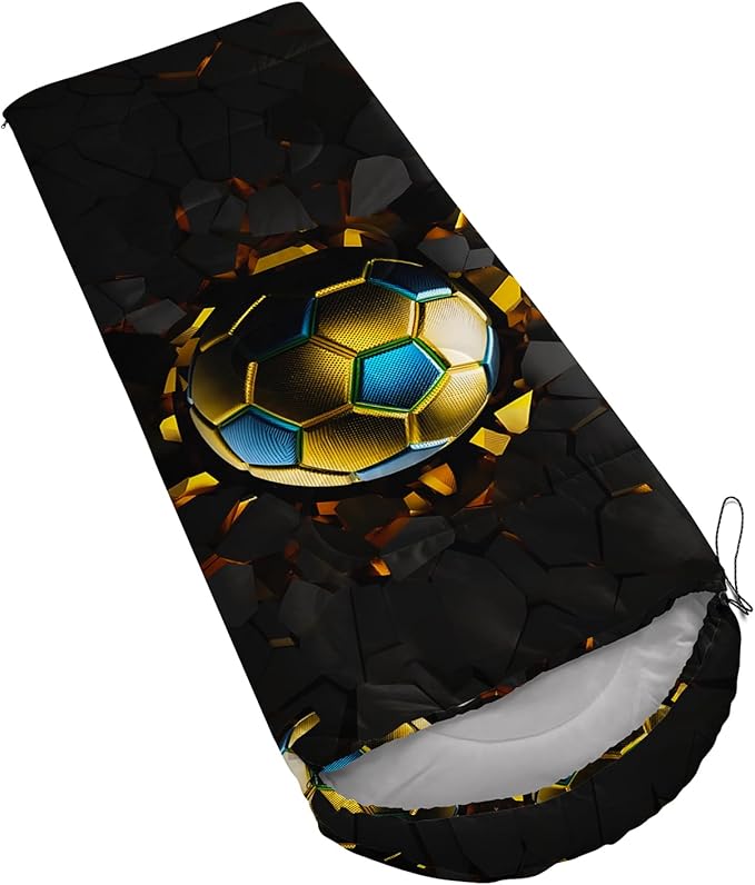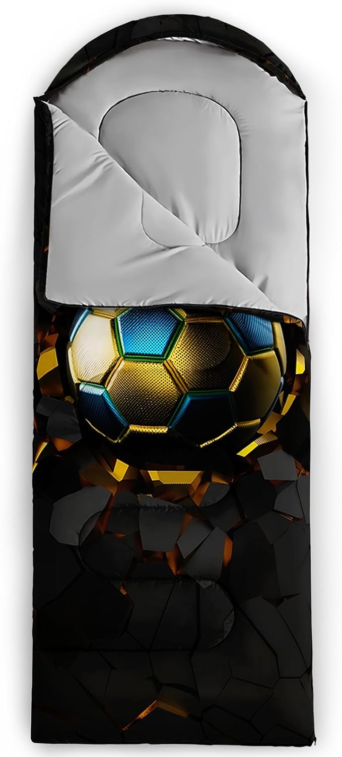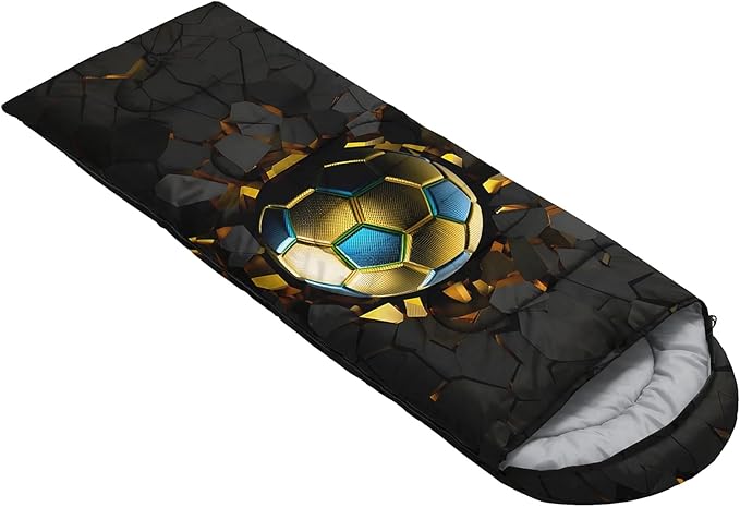 • Unique Soccer Design:This Soccer pattern sleeping bag is made of 3D digital printing with vibrant colors and patterns,size: 31W x 90L inches,temperature range: 32℉-77℉ (0℃-25℃),it also also have a weather resistant waterproof design to keep you warm and prevent you from any dampness,can be used in 3 seasons
