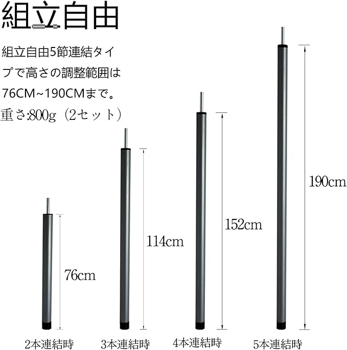 • Each Section is 15 inches long, 0.6" in diameter. Assembled length of one pole is 75". Weight: 1.98 lbs for 2 poles/10 sections. Lightweight.