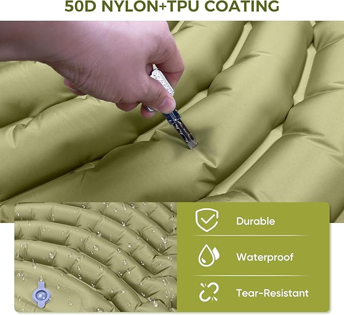 • ✅ 【Tough, Waterproof & Quiet】Made with 50D nylon and TPU coating, this camping air mattress is waterproof, tear-resistant, and ultra-durable. It stays quiet when you move and performs well in harsh conditions. Easy to clean and reliable—your go-to inflatable mattress for outdoor adventures.