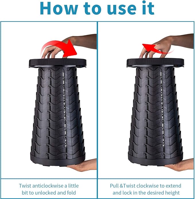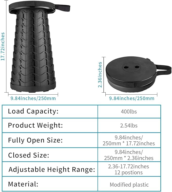 • PORTABLE & LIGHTWEIGHT: This telescopic stool is only 2.54 pounds with dimeter 9.84 inches/250mm. The adjustable strap makes the stool easy to carry in your hand or hanging on your shoulder. Perfect to use for camping, fishing, hiking, hunting, picnic, BBQ. Also can be used in living room, bedroom, bathroom etc
