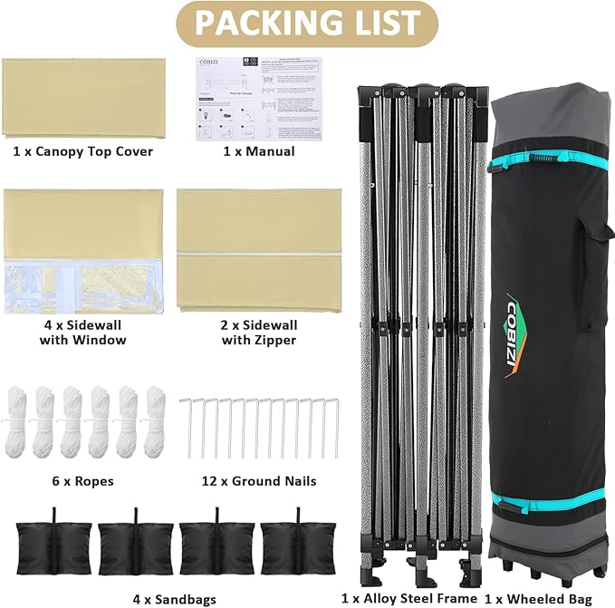 COBIZI 10x20 Pop Up Canopy with 6 Sidewall,Heavy Duty Canopy UPF 50+ All Season Wind Waterproof Commercial Outdoor Wedding Party Tents for Parties Gazebo with Roller Bag(10 x 20 ft Khaki)