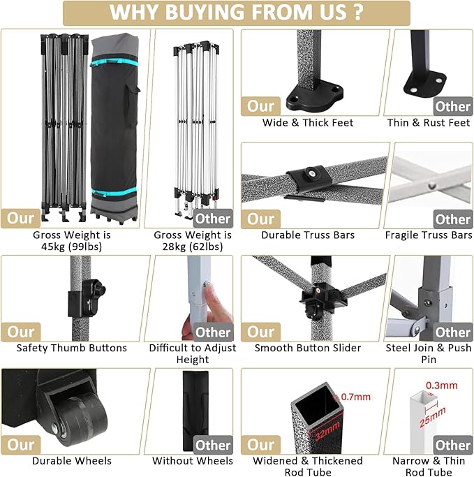 • 【3 Height Settings】10x20 pop up party tent straight leg has 3 height settings. Thumb latch lock system easy to lock and release, raise the pop up tent to a desired height. Canopy tent 10x20 straight leg height options: 220cm/86.6inch, 230cm/90.6inch, 240cm/94.5inch. Corresponding party tent center height options: 310cm/122.0inch, 320cm/126.0inch, 330cm/129.9inch. 10x20 canopy with sidewalls perfect for commercial activities, camping, festivals, tailgating, backyard events and etc..