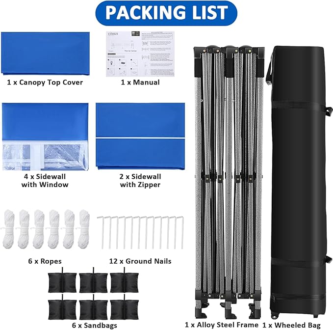 • 【Wheeled Storage Bag】10x20 canopy wheeled roller bag size is 169x46x24cm (66.5x18.1x9.4inch), 600D Oxford Cloth fabric. Storage bag with 3 wheels on the bottom for easy transport. 3 handle on the side for 2 people to lift. 1 handle on the top for 1 people to glide. The Package Includes: Pop up Canopy Frame x 1Pcs + 10′x20′ Canopy Tent Top Cover x 1Pcs + Sidewall with Zipper x 2Pcs + Sidewall with Window x 4Pcs + Sandbag x 4Pcs + Ground Nail x 12Pcs + Rope x 6Pcs + Wheeled Storage Bag x 1Pcs.