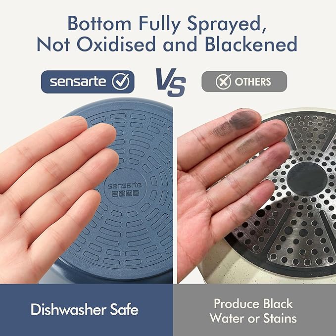 • Dishwasher Safe - This upgraded set features a fully coated bottom that resists discoloration and prevents black residue. Keep your hands, towels, and countertops spotless, while enjoying effortless cleanup—even after repeated dishwashing.