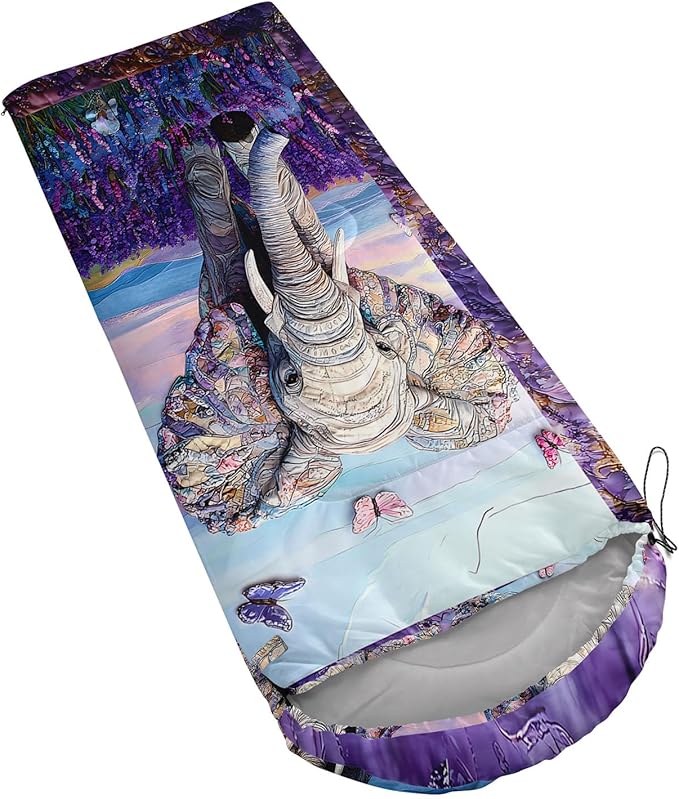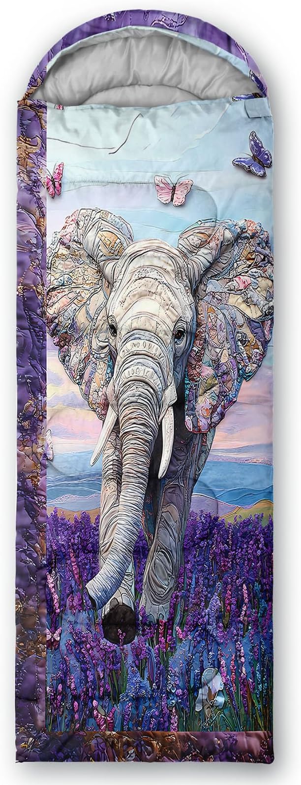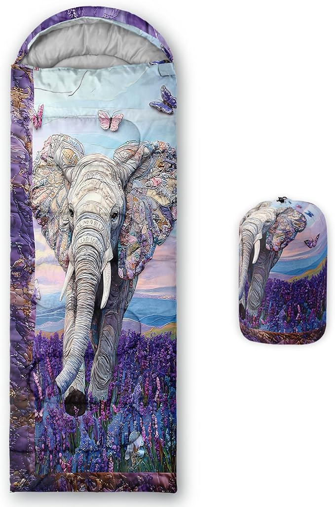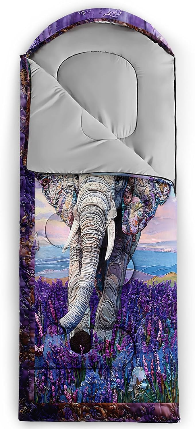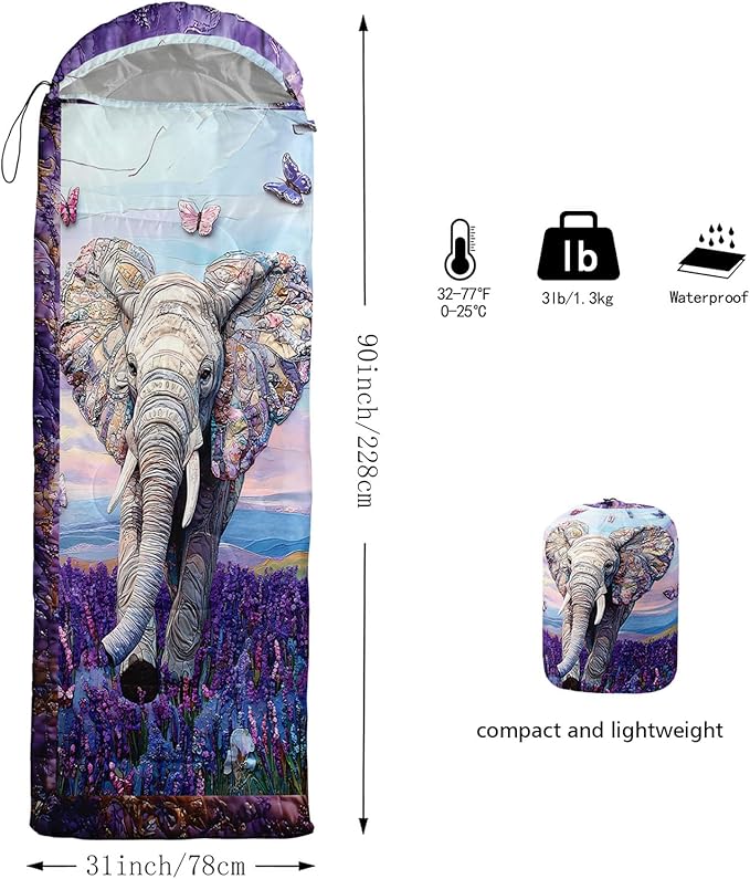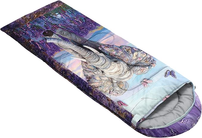 • Unique Elephant Design:This Elephant pattern sleeping bag is made of 3D digital printing with vibrant colors and patterns,size: 31W x 90L inches,temperature range: 32℉-77℉ (0℃-25℃),it also also have a weather resistant waterproof design to keep you warm and prevent you from any dampness,can be used in 3 seasons