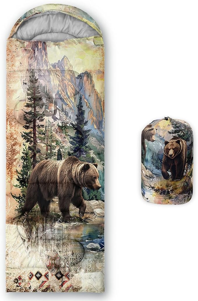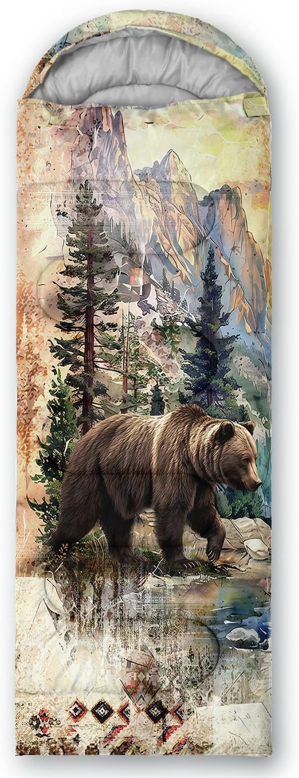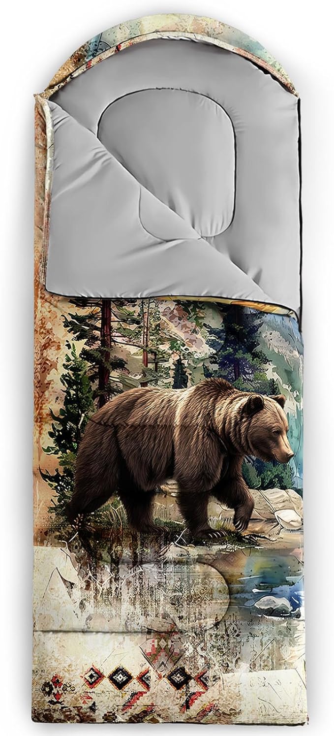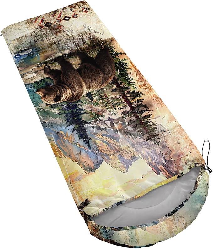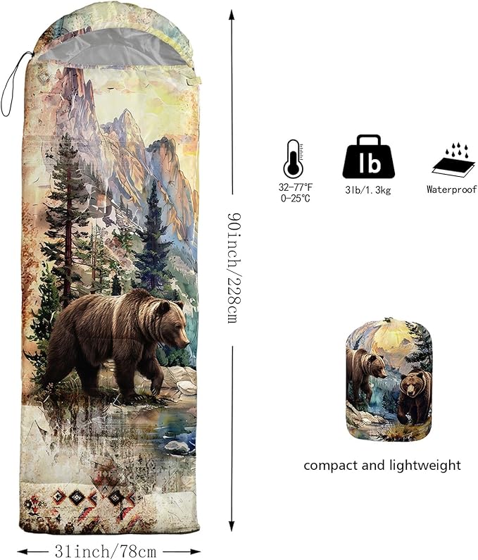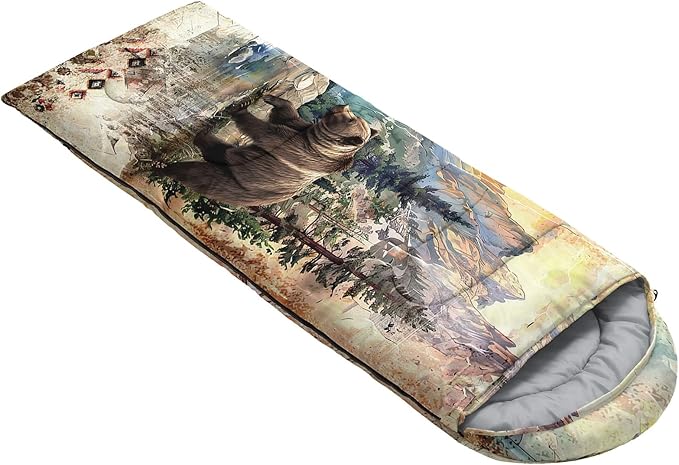 • Unique Rustic Bear Design:This Rustic Bear pattern sleeping bag is made of 3D digital printing with vibrant colors and patterns,size: 31W x 90L inches,temperature range: 32℉-77℉ (0℃-25℃),it also also have a weather resistant waterproof design to keep you warm and prevent you from any dampness,can be used in 3 seasons