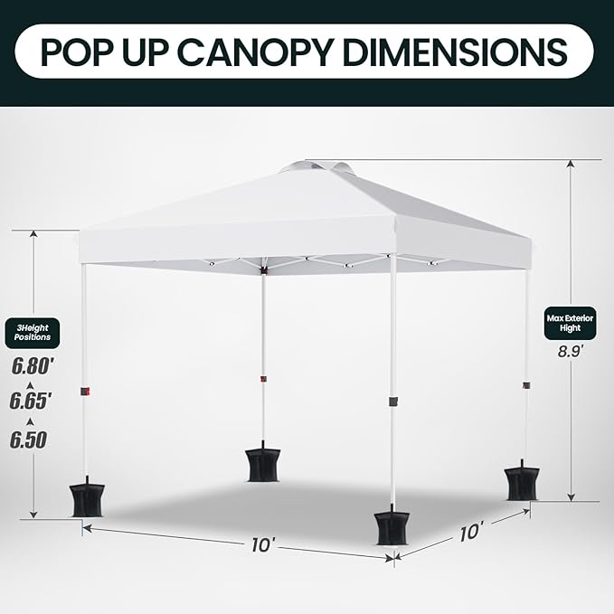 • Easy Up Canopy: This pop up tent can be assembled or packed in 5 minutes by its pop up design. Lightweight assembly design avoids the hassle of traditional tents, giving you more time to enjoy your activities. With three adjustable height settings, this canopy tent offers versatile options for any outdoor occasion, like camping or parties