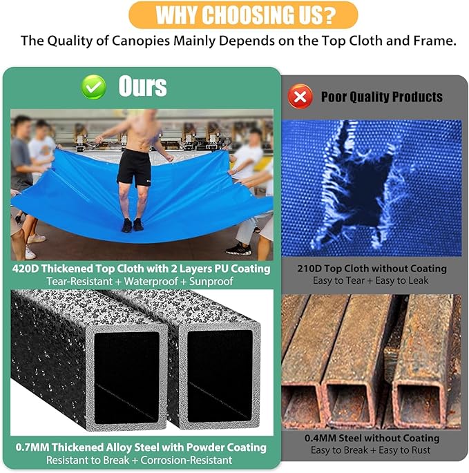 • 【420D PU Oxford Cloth】Heavy duty canopy tent 10x20 is made of 420D Oxford cloth with two layers of PU coating, UPF 50+, which blocks 99% of UV rays. Waterproof canopy gazebo tent with waterproof strip adopts heat-sealed seam technology, 100% waterproof, 1500mm waterproof pressure. Wedding tent professionally protects you from sun, wind and rain. Tents for parties is perfect for playground, yard, beaches, farm, gym, barbecu, trade shows, sporting event, disaster relief or other outdoor events.