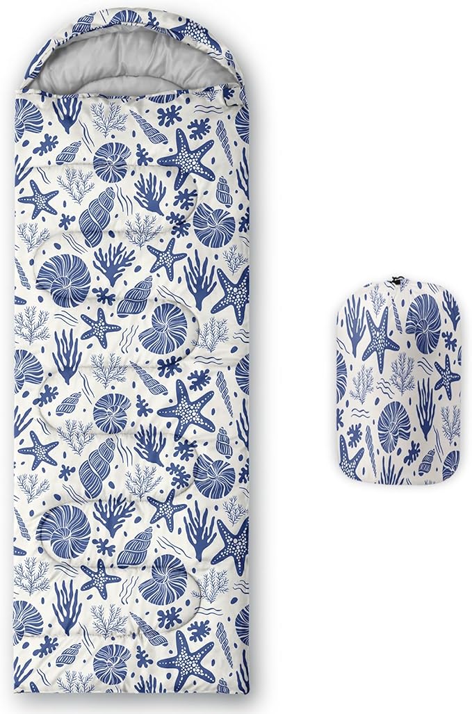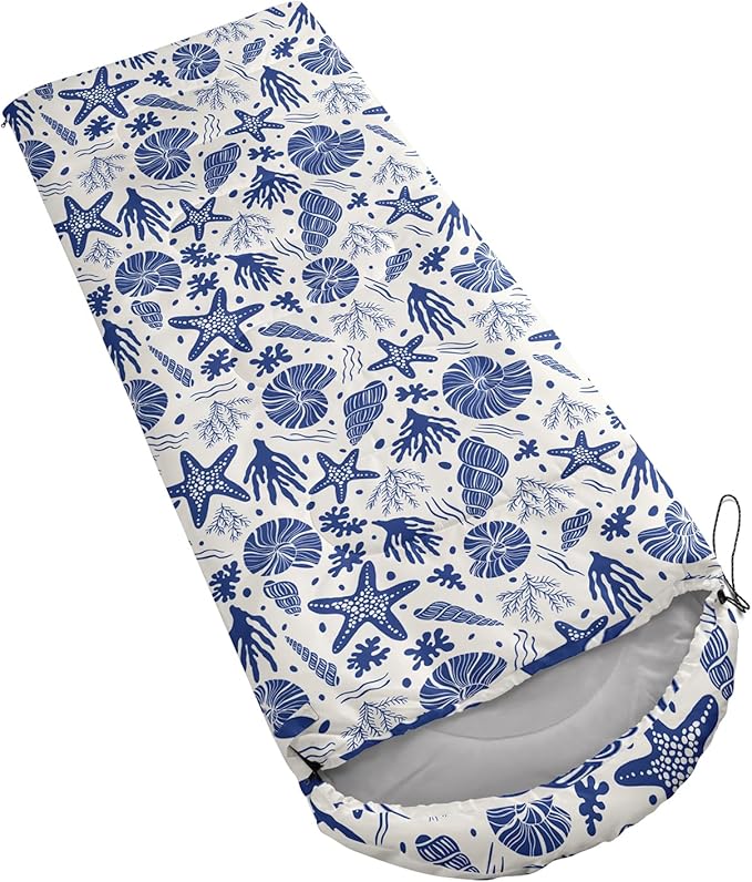 • Unique Shell Design:This Shell pattern sleeping bag is made of 3D digital printing with vibrant colors and patterns,size: 31W x 90L inches,temperature range: 32℉-77℉ (0℃-25℃),it also also have a weather resistant waterproof design to keep you warm and prevent you from any dampness,can be used in 3 seasons