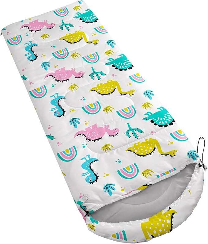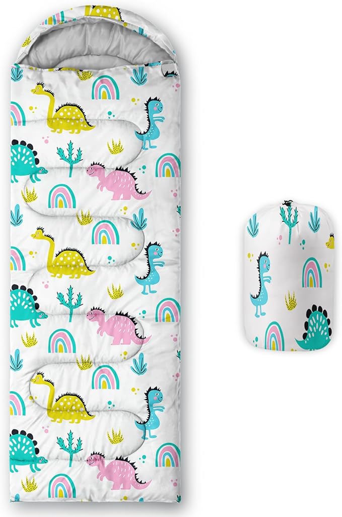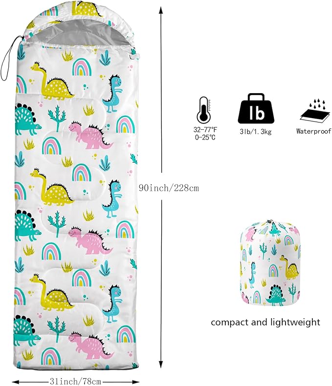 • Unique Dinosaur Design:This Dinosaur pattern sleeping bag is made of 3D digital printing with vibrant colors and patterns,size: 31W x 90L inches,temperature range: 32℉-77℉ (0℃-25℃),it also also have a weather resistant waterproof design to keep you warm and prevent you from any dampness,can be used in 3 seasons